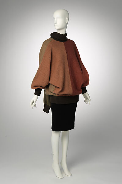 From his debut collection in 1971, Japanese fashion designer Issey Miyake’s work has revolved around textiles and technique, with a particular emphasis on developing new materials and methods of manufacture that synthesize formal and conceptual concerns into highly inventive garments. With this playful sweater titled "Parts Knit,"Miyake "deconstructs" the traditional form of a turtleneck sweater through the introduction of a third arm. This alien appendage straddles functional and theoretical considerations. The additional sleeve introduces several aesthetic possibilities for the wearer, providing a trio of bi-colored faces to choose from.