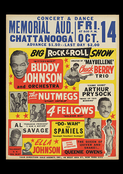 This work of art is currently on loan to the museum.This boxing-style poster is typical of those featuring early rock and rollers, which usually highlight a wide variety of artists appearing at a single event.