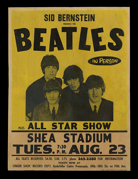 This work of art is currently on loan to the museum.This poster touts the Beatles’ second performance at Shea Stadium, one year after they became the first rock band to play a show at the venue. The expanding scale of rock concerts led to the development of advanced live-sound reinforcement equipment and the genre of "arena rock" in the 1970s.
