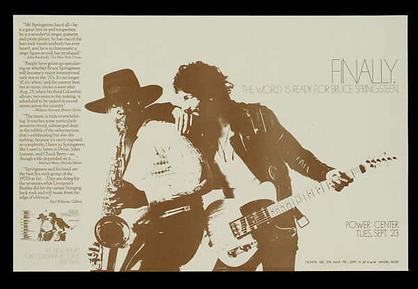 This work of art is currently on loan to the museum.At this 1975 concert on Springsteen’s twenty-sixth birthday, he performed music from Born to Run, which had been released less than a month earlier.