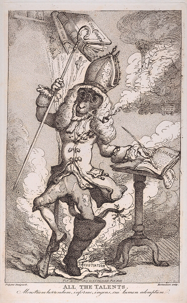Created as a frontispiece to a satirical poem, Rowlandson's etching is based on a drawing by Barrett, the author. The satire responds to the recent fall of a British parliamentary coalition known as the "Broad Bottom Administration," or "All the Talents." Its diverse membership is symbolized by a creature with the head and tail of a monkey, but human body, wearing a judge's wig beneath the mitre of an episcopal bishop and holding a Catholic crosier. Its suit mixes a lawyer's bands with a laced coat, ragged breeches, single shoe, and a French jackboot. The burning papers below refer to the Administration's negotiations with France, and its lost sinecures and patronages. A musket labeled "Army," fired with its right foot, causes volumes labeled "Magna Charta" and "Coronation Oath" to fall from a shelf. With a quill, the animal points to new financial projects, the slip of paper "Country dances" below alluding to the Chancellor of the Exchequer, Lord Henry Petty's love of dancing. Finally, smoke, from the pipe obscures a portrait of William Pitt, whose principles the coalition supposedly honored.