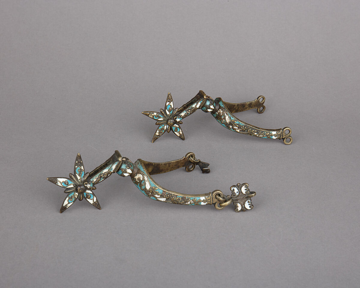 These spurs are rare examples of a distinctive group of English enameled brassware made in London in the workshops of Stephen Pilcherd and Anthony Hatch during the second half of the seventeenth century. Formed of sturdy cast brass and decorated with elaborate foliate and figural ornament picked out in several colors of fired enamel, the majority of these wares were made for domestic use, like candlesticks and firedogs, though the rugged materials were equally well suited for equestrian equipment, like stirrups, spurs, and bits. An important group of these enameled brasses are in The Met’s Department of European Sculpture and Decorative Arts, whereas the holdings of the Department of Arms and Armor include, in addition to these spurs, a pair of stirrups (2018.66a, b). The spurs are the only recorded matched pair of their kind.