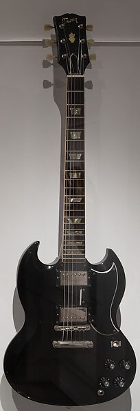 This work of art is currently on loan to the museum.Angus Young, a cofounder of the Australian hard rock band AC/DC, has used Gibson SGs exclusively throughout his career with the band. He was initially attracted to the model because of its light weight and easy playability during his high-energy performances. Young has played this guitar since the 1980s in concerts including Live at Donington and Live at River Plate, and at the Grammys in 2015. Its original vibrato tailpiece has been removed. Young never relied on effect to achieve his signature tones—just his guitar, amplifier, and a preamp.