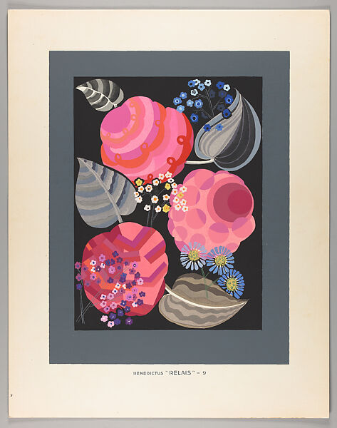 "Spectacular set of pochoir plates by Benedictus who was famous for his elegant silks and satins designed for top firms such as Brunet, Meunié et Cie., and Tassinari et Châtel. His rugs decorated the Grand Salon and Music Room of the magnificent French Embassy at the 1925 Exhibition. The pochoirs were executed by Saude, the foremost practitioner of that art." -- description by Ursus Books