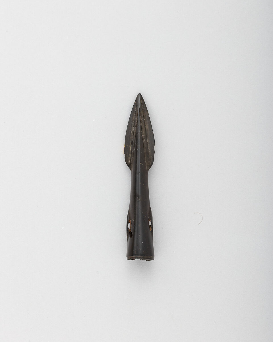 Discovered in West Overton, Wiltshire, this spearhead is a well-preserved example of a type that was favored in Middle Bronze Age Britain. The leaf-shape of the blade and the small loops at each side of the socket are characteristic. The loops were presumably used to tie the head to the wood haft, though some of these heads may have been made for deposition purposes, and thus never seen active service in combat or the hunt.