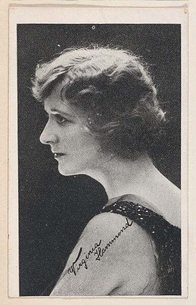 Virginia Hammond from "Leading Moving Picture Stars" (W623). Issued ca. 1917 by Kromo Gravure Photo Company, Detroit, Michigan. Several sets of photos of early silent film screen stars were available over the counter in packages/ boxed sets of 50 unnumbered cards for a dime. Cards were sold to other companies for their movie card promotions. Blank back or may include advertising information. Black and white images with white borders. Facsimile signatures. Printed on heavy paper stock. Kromo Gravure and title -- "Leading Moving Picture Stars" -- printed on box.