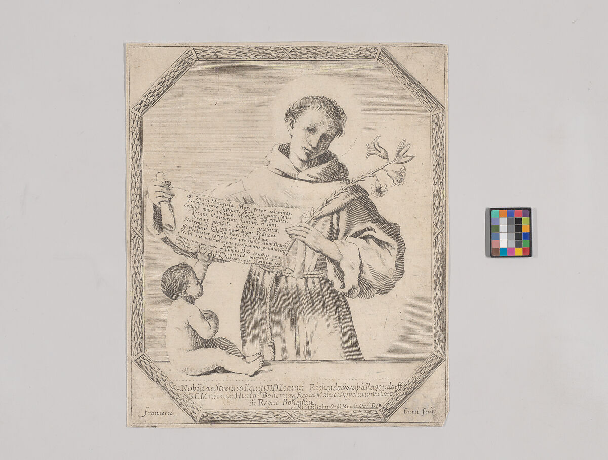 - Title: Saint Anthony of Padua holding a lily and a scroll, with an infant at lower left