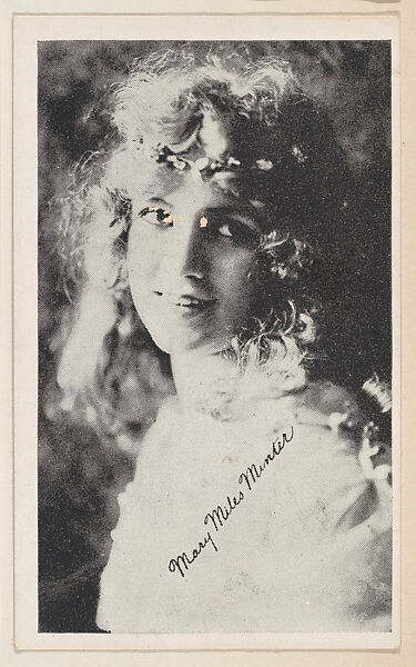 Mary Miles Minter (with headband) from "Leading Moving Picture Stars" (W623). Issued ca. 1917 by Kromo Gravure Photo Company, Detroit, Michigan. Several sets of photos of early silent film screen stars were available over the counter in packages/ boxed sets of 50 unnumbered cards for a dime. Cards were sold to other companies for their movie card promotions. Blank back or may include advertising information. Black and white images with white borders. Facsimile signatures. Printed on heavy paper stock. Kromo Gravure and title -- "Leading Moving Picture Stars" -- printed on box.
