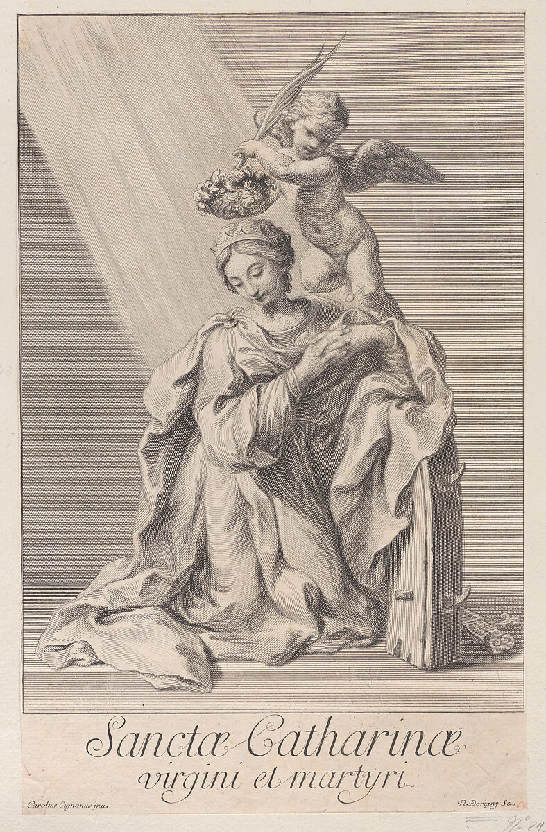 - Title: Saint Catherine of Alexandria, kneeling with her elbow resting on the spiked wheel, and an angel crowning her with a flower wreath