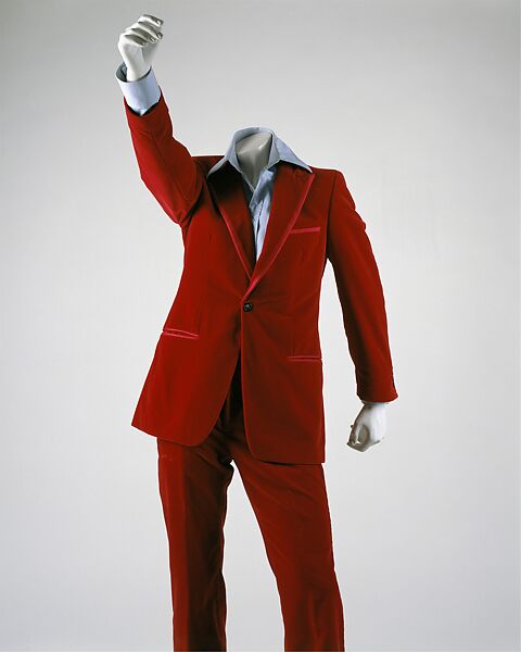 Tom Ford's designs, derivative of the 1970s, seize the sensuous indulgence of the lounge lizard and "Studio 54" era, especially in this bright velvet suit that seems ready for the disco floor despite its date of 1996. Ford's acumen is to make this fashion look new after an interval of only two decades.