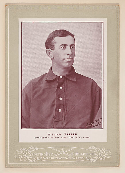 William Keeler from Sporting Life Cabinets (W600). Issued from 1902 to 1911 by Sporting Life Newspaper Company, Philadelphia. Set consists of over 680 unnumbered cards. Player portraits are by photographer Carl Horner. Black and white or color tinted player photo. Player's name, position and team printed below studio portrait. Player shown either in uniform or in street clothes. Mounted on a thick cardboard frame. Issued in individual glassine envelopes. Ornately embossed mounts found in one of four design variations. Blank back. Sponsor ad stamped on back of some cards.