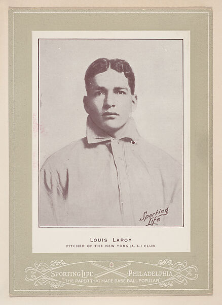 Louis Laroy from Sporting Life Cabinets (W600). Issued from 1902 to 1911 by Sporting Life Newspaper Company, Philadelphia. Set consists of over 680 unnumbered cards. Player portraits are by photographer Carl Horner. Black and white or color tinted player photo. Player's name, position and team printed below studio portrait. Player shown either in uniform or in street clothes. Mounted on a thick cardboard frame. Issued in individual glassine envelopes. Ornately embossed mounts found in one of four design variations. Blank back. Sponsor ad stamped on back of some cards.