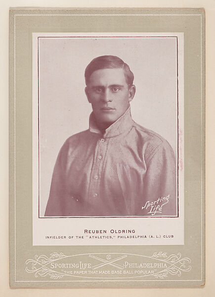 Reuben Oldring from Sporting Life Cabinets (W600). Issued from 1902 to 1911 by Sporting Life Newspaper Company, Philadelphia. Set consists of over 680 unnumbered cards. Player portraits are by photographer Carl Horner. Black and white or color tinted player photo. Player's name, position and team printed below studio portrait. Player shown either in uniform or in street clothes. Mounted on a thick cardboard frame. Issued in individual glassine envelopes. Ornately embossed mounts found in one of four design variations. Blank back. Sponsor ad stamped on back of some cards.