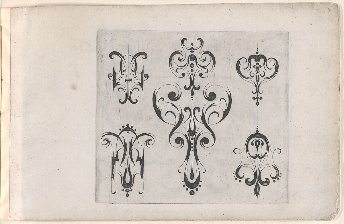 Plate from a print series consisting of a title page and five plates displaying motifs for the application in goldsmith's work, executed in blackwork. The plate contains five distinct designs, with one larger motif in the center and two smaller ones on either side. The two designs on the left have angular shapes closely related to schweifwerk ornament, while the other three motifs are characterized by curved flowing lines.