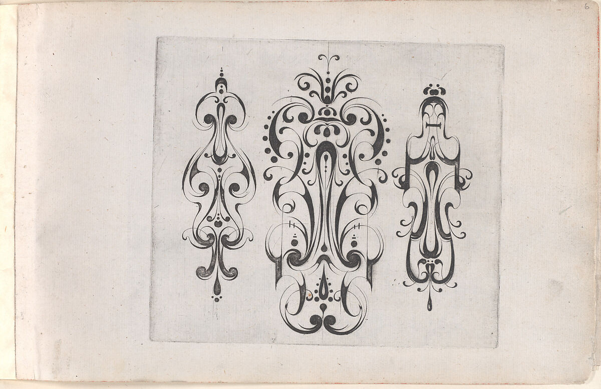 Plate from a print series consisting of a title page and five plates displaying motifs for the application in goldsmith's work, executed in blackwork. The plate contains three distinct motifs, with one large motif in the center and a smaller motif on either side. The central motif and the one to the right both have small angular elements of schweifwerk incorporated in their design.