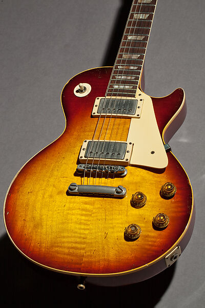 This work of art is currently on loan to the museum.Gibson, at first skeptical of the electric solid-body guitar, introduced the Les Paul model in 1952 to compete with Fender’s Telecaster. In 1958, they debuted the Les Paul Standard, featuring a mahogany body with a figured, domed maple top; this referenced the craftsmanship of the classic archtop guitar in modern solid-body form. Produced only until 1960, the original Les Paul Standard is one of the most sought-after guitars ever made. This example was owned and played by the late Paul Kossoff of Free. He acquired it from Eric Clapton when Blind Faith and Free toured together in 1969.