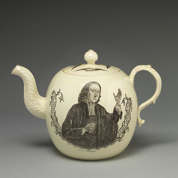 This transfer-printed teapot depicts the theologian and preacher John Wesley (1703-91), who helped found the Methodist movement in England. Wesley’s traveling ministry took him across England and Ireland, and in 1760 encountered Josiah Wedgwood during a visit to Staffordshire. Wedgwood was a Rational Dissenter, a sect of protestant reformers like the Methodists. Rational Dissenters emphasized a spirituality tempered by reason and learning, a freedom of conscience, and a critical stance towards the enormous political and economic power wielded by the Church of England.