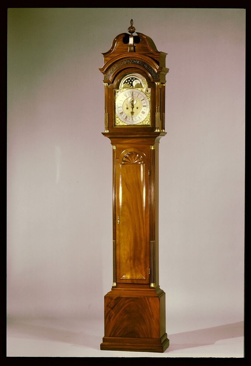 The dial on this clock exemplifies the type of dial William Claggett made in his mature period. It is characterized by a large painted series of the moon's phases with a narrow name plate above it, which conforms to the arch. On this clock, the subsidiary dials are an unusual feature. The housing for the dial is stylistically the most advanced of the case housings for his works. The broken scroll pediment over and arched cornice is known on no other Claggett clock case.