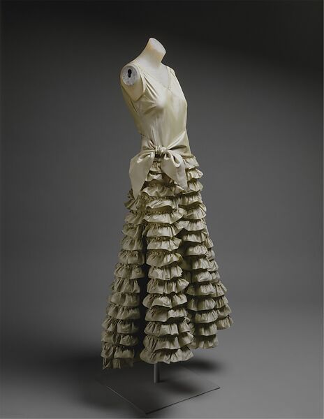 A silk tulle skirt is obscured by bias ruffles, bringing the relatively flat bias construction of Vionnet to a more three dimensional application. Other bias bands crisscross at the neckline, joined imperceptibly to the body of the dress by a narrow web of tulle.