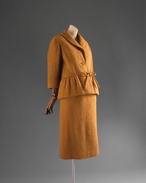 This suit demonstrates Cardin's penchant for creating dramatic form from cloth. He extended the conventions of strict tailoring to incorporate a soft peplum with a controlled gathering that reveals his understanding of the balance and grain of fabric. His predisposition to an architectonic approach is evident in his shoulder and sleeve treatment. Cardin's innovation in the 1950s was his ability to think in terms both of fashion subtlety and semaphore, seeking the graphic emblem without vitiating the qualities of tailoring.