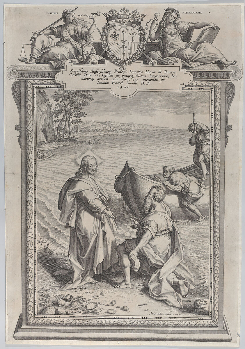 - Title: Christ calling Saint Andrew, who kneels before him on a beach, and Saint Peter, who climbs out of a boat at right