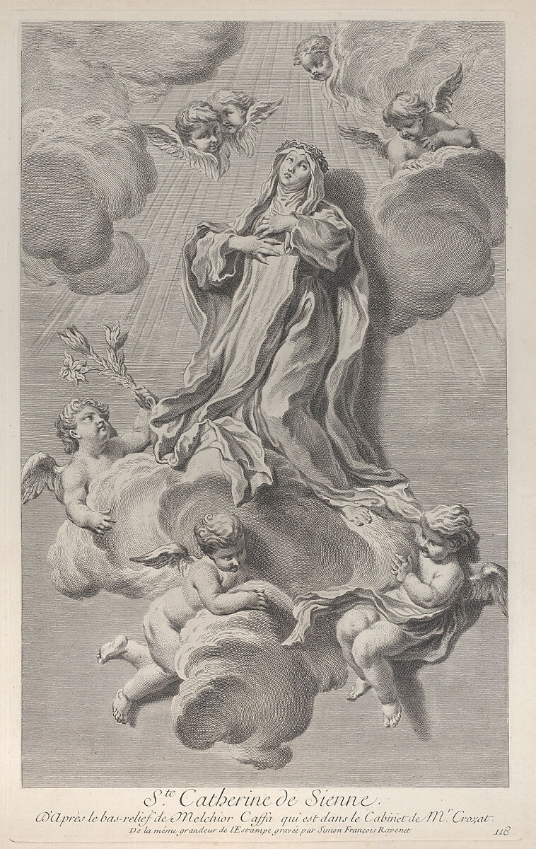 - Title: The Ecstasy of Saint Catherine of Siena, kneeling on a cloud carried by angels, one of whom holds a lily