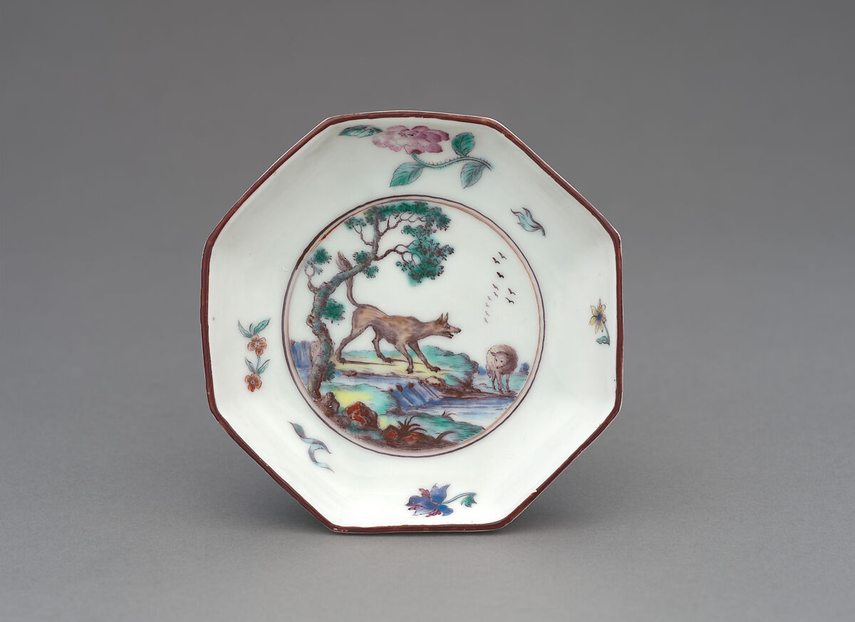 The Chelsea factory often used illustrations drawn from Aesop’s Fables to decorate porcelain in the early 1750s. Much of the best painting of Fable scenes was executed by Jefferyes Hammet O’Neale, to whom the decoration of these pieces is attributed.