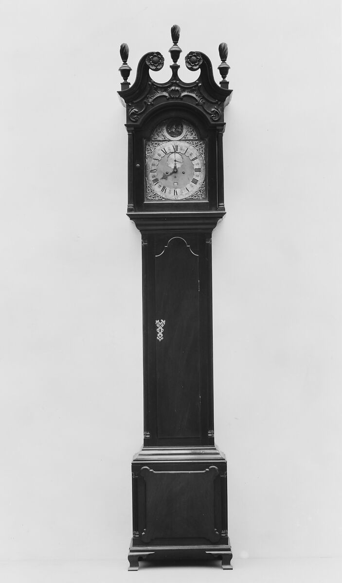 The classic Philadelphia Chippendale-style clock case has a broken-scroll pediment, applied carving, and flame finials—all features found on this example.