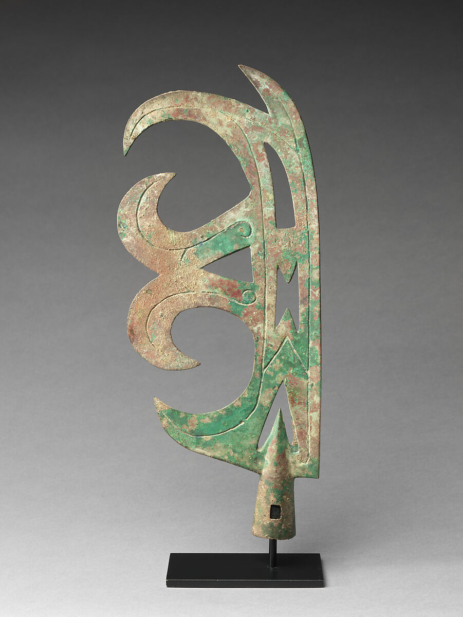 The dramatic and imposing shape of this massive blade exemplifies the flamboyant style of bronze decoration in the early Western Zhou dynasty (ca. 1046–771 B.C.) and suggests that it served as a ceremonial weapon or ritual finial.