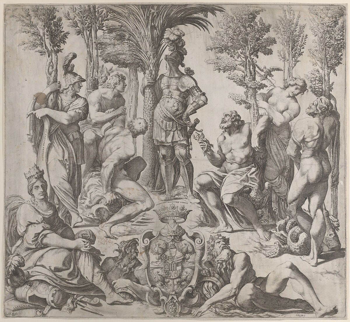 Allegorical composition with six Olympian gods gathered around a figure in armor