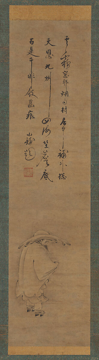 This painting depicts the Song-dynasty poet Su Dongpo (1037–1101), exiled on Hainan Island, in a borrowed bamboo hat and clogs during a sudden downpour. The poem was brushed by Ōsen Keisan, one of the most prominent Zen monks of the fifteenth century. It reads: