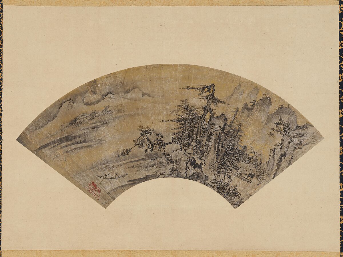 A rocky landscape of boulders and twisting pines dominates the curved surface of the fan painting. A distant landscape of towering peaks is partially obscured by a mist of gold wash, and in the foreground a small peasant hut is visible on the right, two boatmen on the water on the left. The composition is representative of the type of landscape image popular among Japanese ink painters of the late Muromachi period, who took as models both Chinese Southern Song dynasty academy paintings of the thirteenth century and later Chinese academic paintings of the Ming dynasty. The artist’s brushwork is characterized by a nervous, jagged line, but the handling and placement of the pictorial elements—generally weighted on the right side of the composition—the use of outlines, ink dots, and the overall theme of the image indicate that he had studied ink painting technique and was familiar with ink landscape paintings by Chinese artists, or perhaps Japanese copies of them.