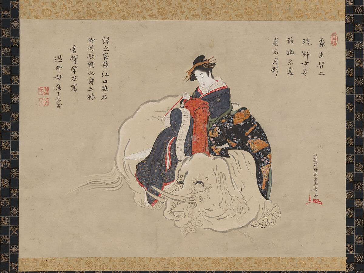 By the Edo period it had become common to create parodic versions of Tae as an incarnation of the bodhisattva Fugen (Sanskrit: Samanthabhadra), who is usually portrayed riding an elephant, his sacred vehicle. By presenting the bodhisattva in the guise of a prostitute, Shunshō demonstrates the Buddhist concept that appearances are unreal and that there is no fundamental difference between sanctity and sinfulness.