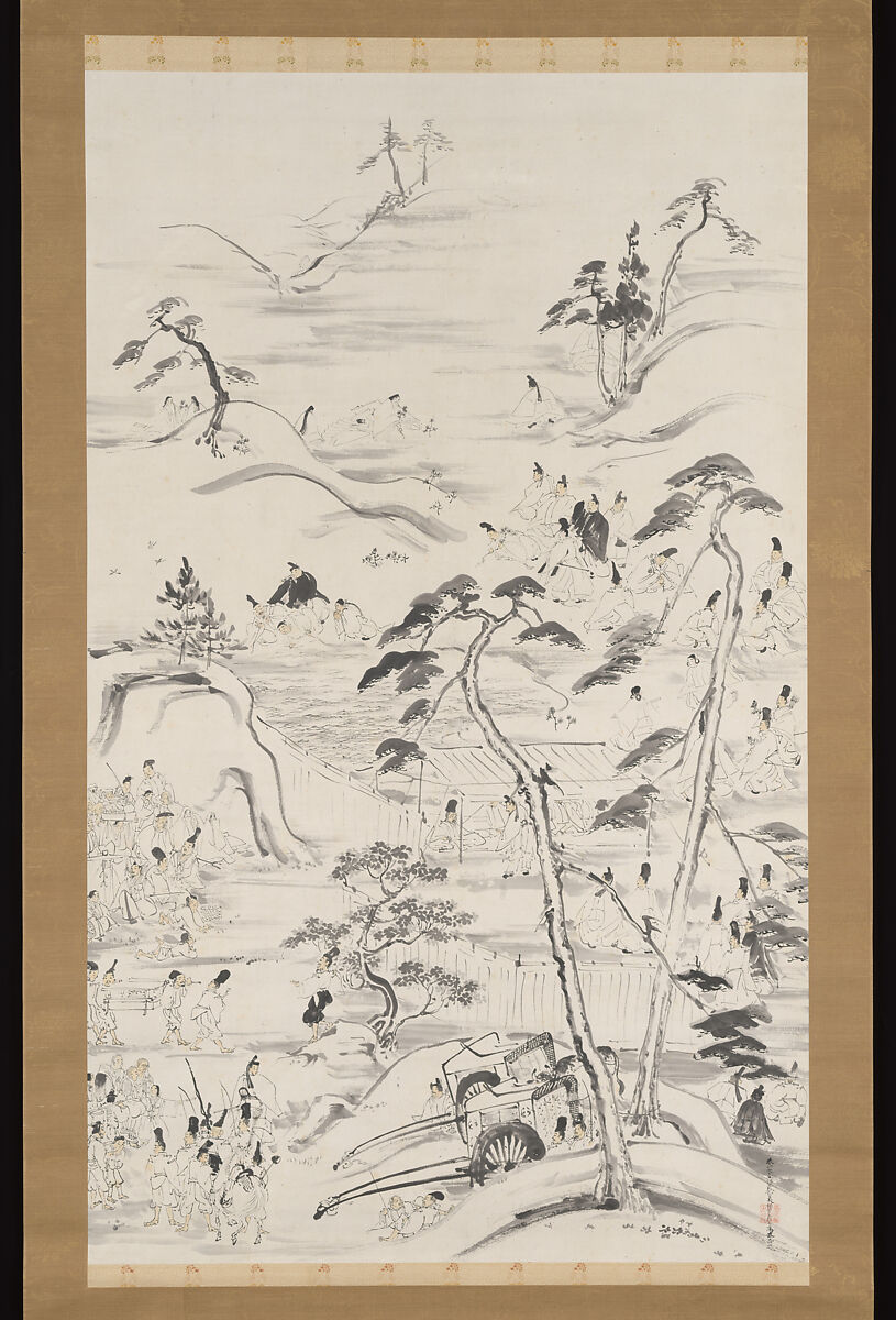 This composition in ink with touches of light color depicts the 10th century Emperor Enyū and his entourage on an outing from Kyoto to the mountain of Funaokayama—an ancient reference point for the northerly direction—in the New Year. The work, created with soft brushstrokes and wash for the landscape elements and finer ink lines for the figures, has deliberate stylistic antecedents in the yamato-e style of narrative painting from the twelfth through fourteenth centuries, in the late Heian and Kamakura periods. The courtiers, robed in either black or white and sporting the usual tall, lacquered courtier’s caps, are scattered throughout the composition; two carriages (of the ox-drawn type used by aristocrats) stand in the foreground.