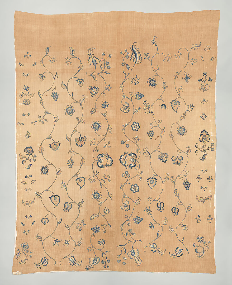 Eighteenth-century American embroidered domestic furnishings, such as curtains and bedcovers, are rare survivals, and most examples are found preserved in museums. The Met is lucky to have quite a number of pieces, collected between 1922 and the present day (22.55, 24.188, 44.140. 61.48.1,.2, 2000.205). Few pieces, whether bedcovers, bed curtains, or indeed items of embroidered clothing, are in pristine original condition—this type of embroidery was considered so valuable, and so evocative of the amateur embroiderer who spent the hours of time working it, that it was frequently salvaged and reused. In all likelihood, the embroidered vines on this bed cover originally decorated a set of narrow head bed curtains. When the fine linen of bed curtains became too worn, the embroidery was carefully cut out, and appliqued onto a heavier linen sheet in order to use it as a bedcover. It is not immediately apparent when this may have happened—it could have been as early as the turn of the 19th century, since the ground sheet appears to date from then, or post-1876, when the Colonial Revival movement was in full swing, and pieces resonant with our country’s Colonial past were particularly treasured The bedcover seems to have descended in the Cabot family, since there is an old paper label on it signed by Walter Channing Cabot (1829-1904). In the eighteenth century, when the embroidery was made, the Cabots resided in Salem, Massachusetts