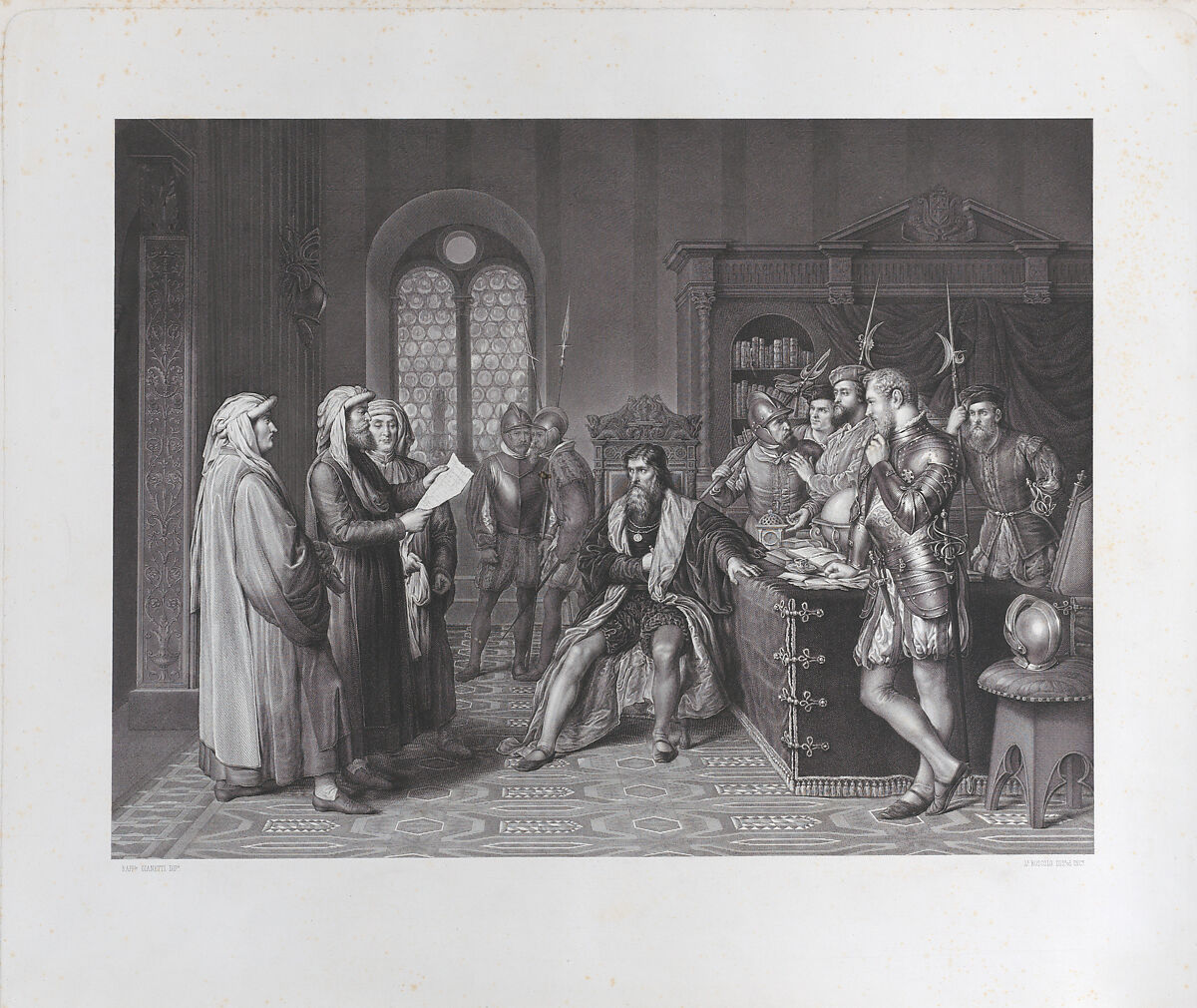 - Title: Scene with Columbus (?) at center, soldiers at right, and men in robes at left