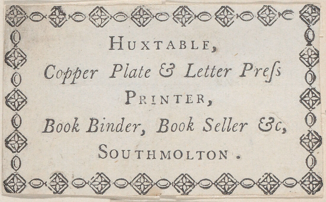 Trade Card for Huxtable, Printer, Book Binder, and Bookseller