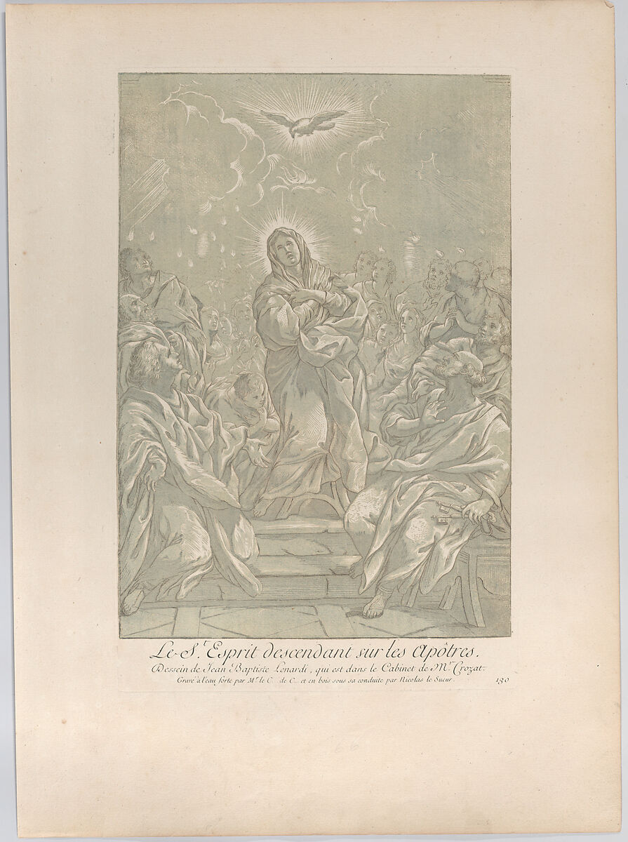 - Title: The Pentecost, with the Virgin standing at center, the Holy Spirit above, and Apostles on both sides