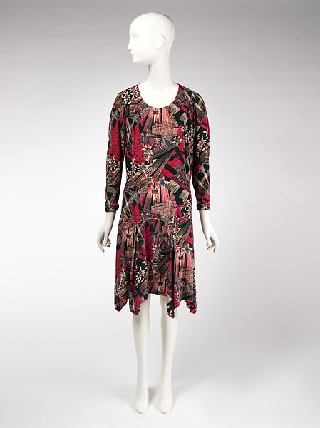 This printed dress is composed from silk produced by the famed early twentieth century American manufacturer H.R. Mallinson and Company. The design, "Betsey Ross - Liberty Bell," was among several introduced during the spring of 1929, as part of the company's "Early American" series. Mallinson was a leader in promoting American textiles during a period in which European silks, particularly French products, still maintained a degree of hegemony. This print features a variety of patriotic motifs including the Liberty Bell, Independence Hall, and thirteen stars and seals representing the original American colonies. Despite the traditionalism of the subject matter, the design has been rendered with a modern stylized hand, replete with bold geometric forms in a dynamic layout that reflects the aesthetics of the period and the vogue for Art Deco.