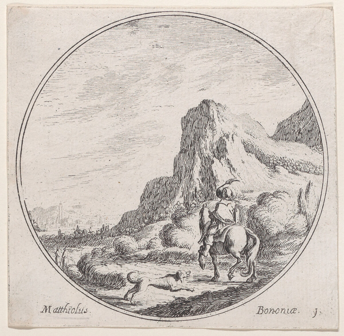 - Title: Plate 1: a horseman riding towards the left, followed by a dog, in a rocky landscape