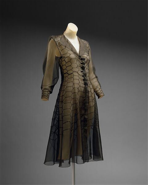 Vionnet offered an ultimate performance in lithe equilibrium with a bodice constructed of one piece, seamed at the waist. All shaping is created by the graduated hexagons. Thus, Vionnet imposed form through the illusion of embellishment but carefully concealed a system of miniscule adjustments into the design of the tucking. This sublimated essential structure is akin to modern architecture's streamlined vocabulary of ornament to serve compositional needs.