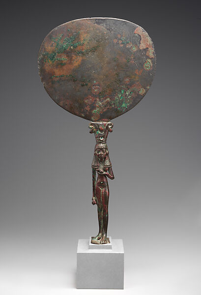 The use of mirrors with figural handles is not well understood, but they are drenched in elements that are considered to symbolize the goddess Hathor, a deity who was both emblematic of fertility and a fierce protector of the sun. We understand that mirrors, especially those decorated with Hathoric elements, were used to symbolize the goddess at certain events. Given the presence of a base and considering later Dynasty 25 ritual (ca. 713–664 B.C.), it seems likely this piece was, during some part of its life, offered to the goddess, perhaps during a festival.