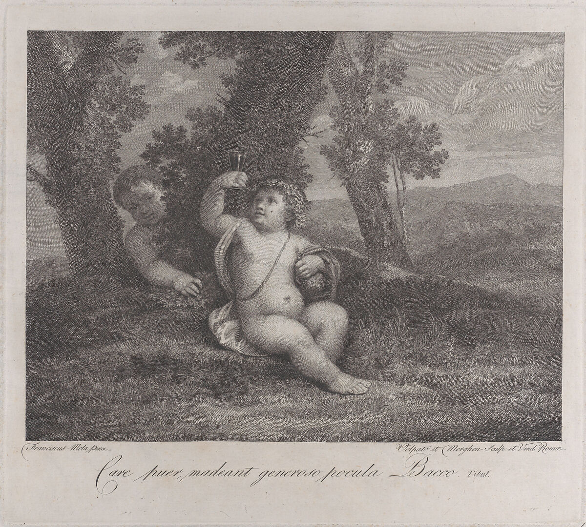- Title: The infant Bacchus seated under a tree, holding up a wine glass, with another infant behind him at left