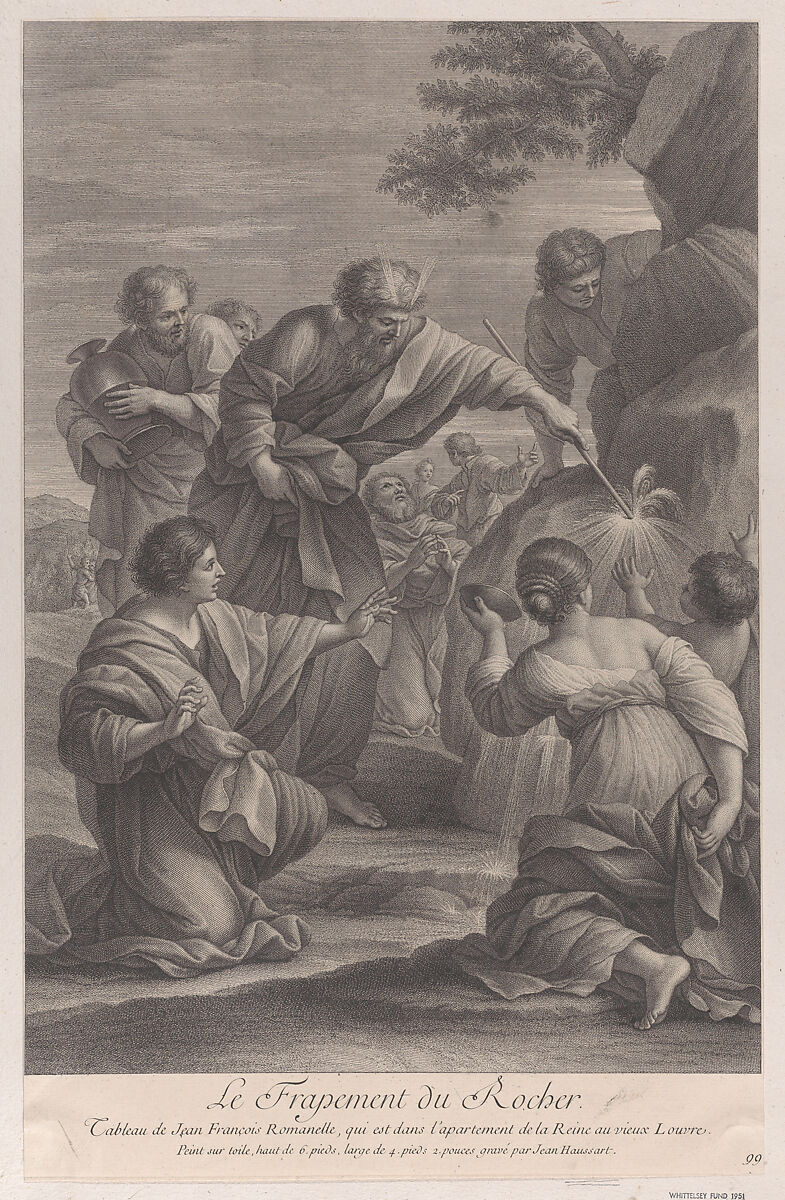 - Title: Moses striking the rock with a stick to bring forth water, while the Israelites look on in amazement