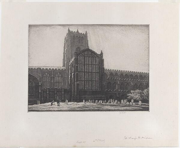One of Britain's last great participants in the Etching Revival, Griggs trained as an architect and only began to etch in his thirties. An admirer of Samuel Palmer's etchings, Griggs's imagery responds to England's medieval past, an affinity strengthened by his conversion to Roman Catholicism in 1912. Campbell Dodgson has described the artist as "faithful to the Cotswolds, to [the village of Chipping] Campden, and to the Gothic architecture of England....[demonstrating] the slowly matured and mellowed outcome of contemplation and of a high purpose early formed and consistently pursued." This poetic image represents a fifteenth-century Gothic church cast into relief by low morning sunlight, with threads of rain passing the tower and a gravedigger at work in the yard, watched by another man.