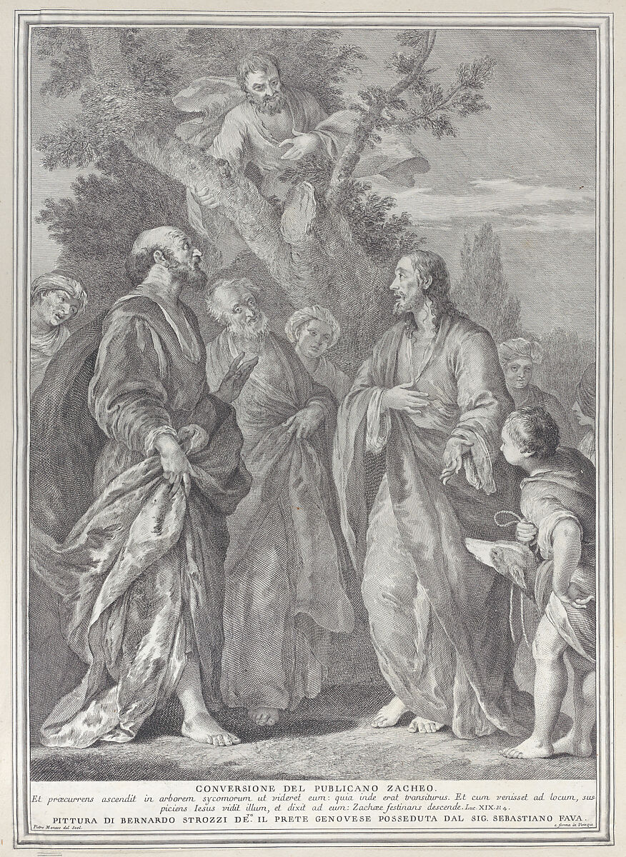 - Title: Conversion of Zacchaeus, with Christ at right addressing the tax collector, who is seated in a tree at top center