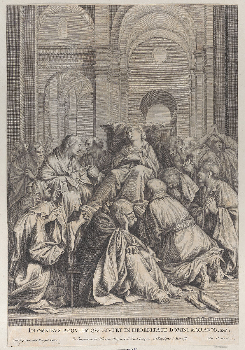 - Title: Death of the Virgin, lying on a chair at center, surrounded by Apostles, inside a temple