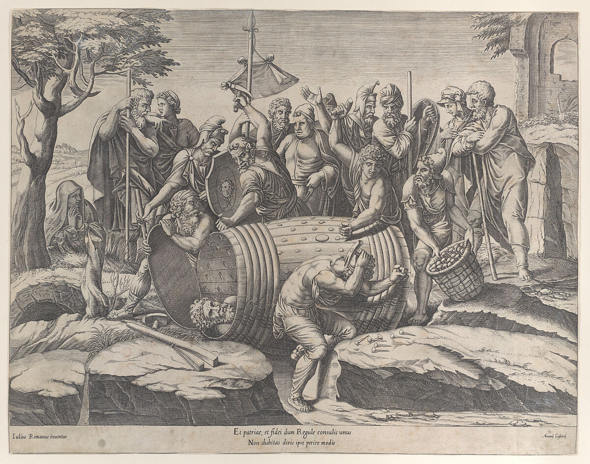 Marcus Atilius Regulus in a barrel while two men are hammering in the nails, various figures throughout
