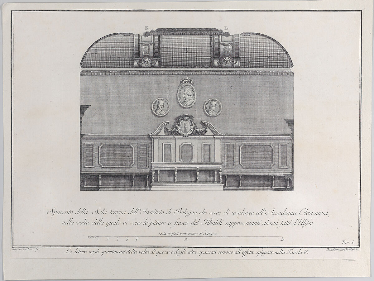 - Title: Plate 1: cross-section of the Hall of the Institute of Bologna, which served as the residence for the Clementine Academy, with fresco paintings by Pellegrino Tibaldi in the vault