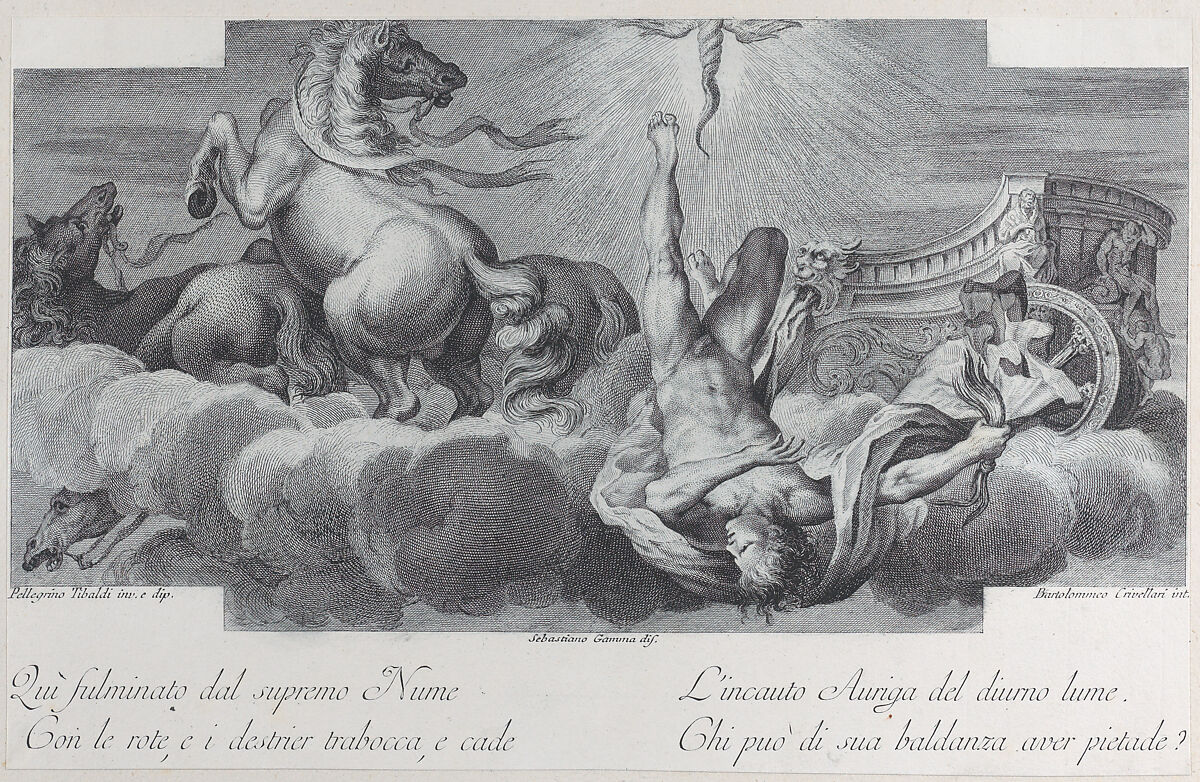 - Title: Plate 34: Auriga, the charioteer, falls from the chariot at center, with three horses at left